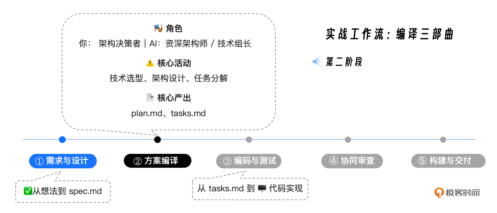 今天这一讲,我们的目标,就是完成“编译三部曲”的第二乐章——计划与任务。我们将继续扮演“工作流指挥家”的角色,引导我们的 AI 伙伴,将高层级的 spec.md,“编译”成两份至关重要的工程文档:一份是详尽的技术方案 plan.md,另一份则是 AI 可以直接执行的、原子化的任务列表 tasks.md。