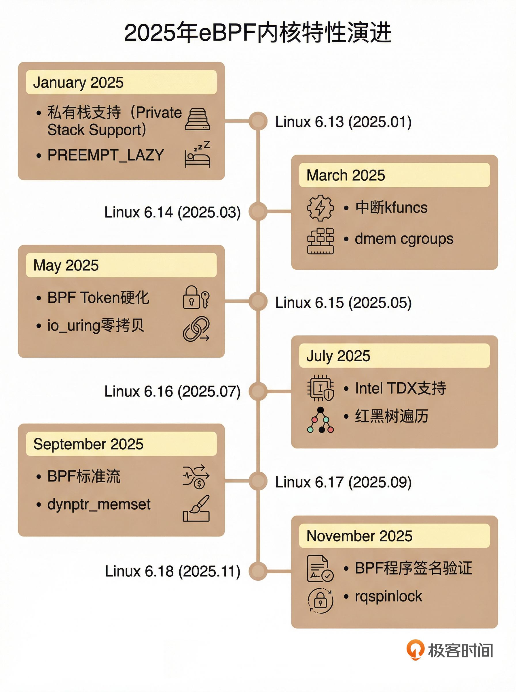 2025 年,Linux 内核发布了 6.13 至 6.18 这六个重要版本,每个版本都为 eBPF 引入了众多新特性。如下图所示,列出了这些版本的发布时间和核心特性: