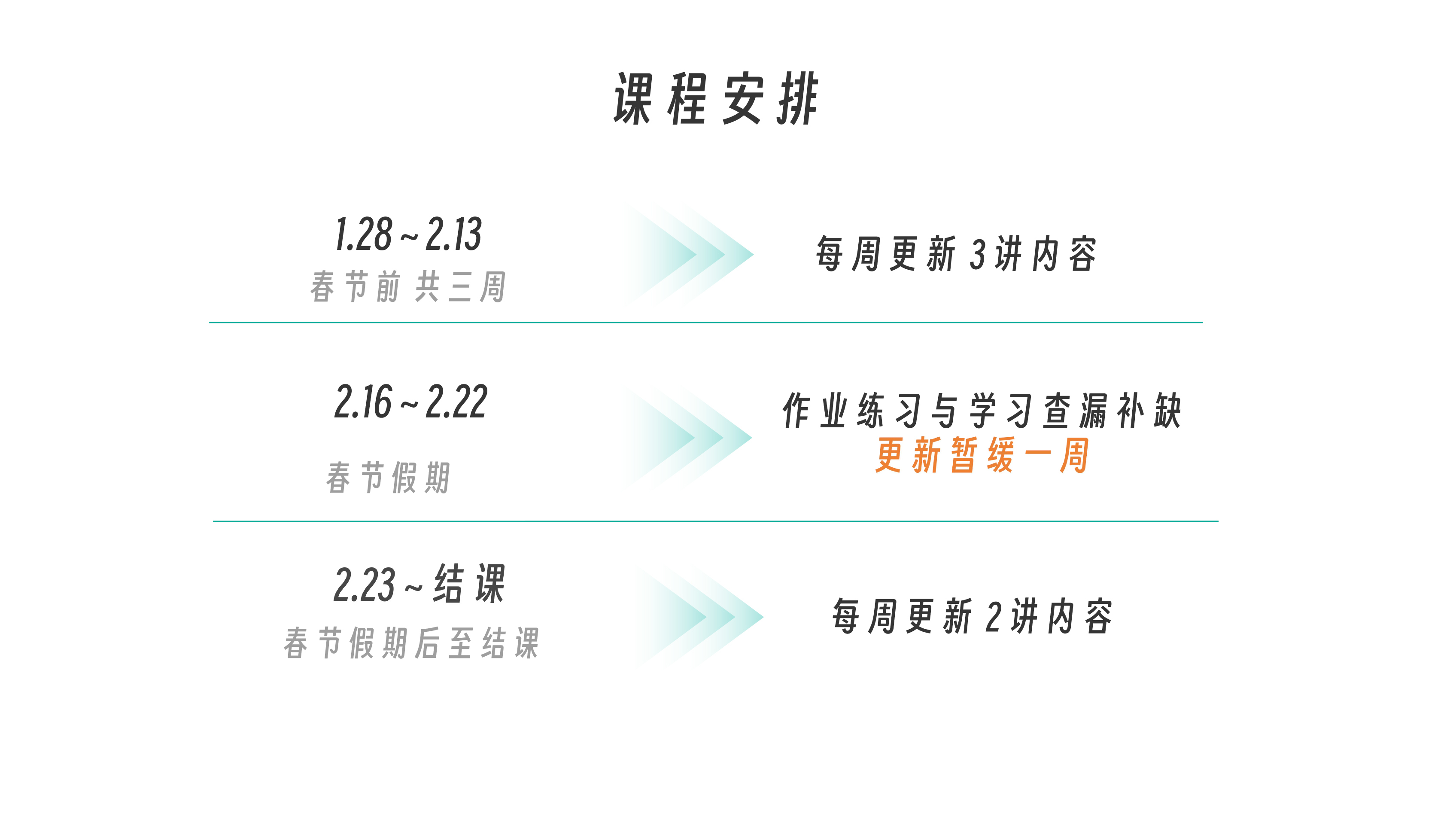 这样的节奏安排,主要是综合考量了交付质量保障和大家的学习习惯而制定的——既保证每周有稳定的、高质量的内容准备,也给同学们预留了跟学跟练、消化吸收的时间。