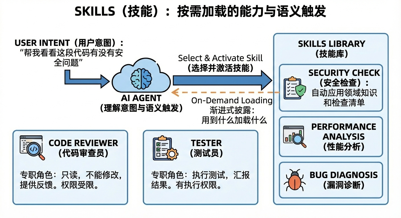 传统工具需要用户手动触发——你输入 /review,它就审查代码。但 Skills 不同,你只需要说“帮我看看这段代码有没有安全问题”,AI 就能自动判断这是代码安全审查任务,并自动激活对应的 Skill,自动应用领域知识和检查清单。