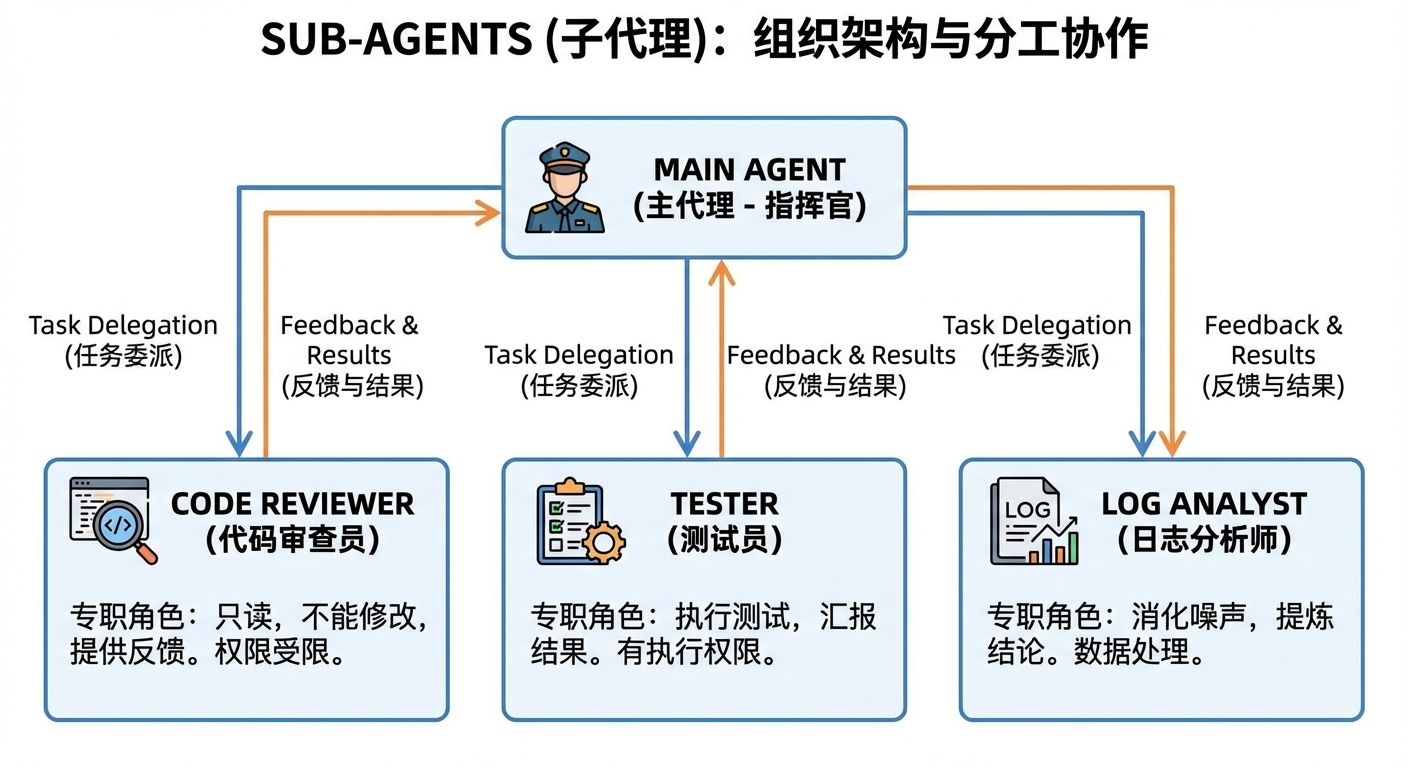 就像一家公司不会让 CEO 亲自写代码、做测试、查日志,AI Agent 也需要“组织架构”。我们可以这样理解,主代理是指挥官,子代理是专业兵种。有人负责代码审查(只读,不能改),有人负责跑测试(执行,汇报结果),有人负责分析日志(消化噪声,提炼结论)。