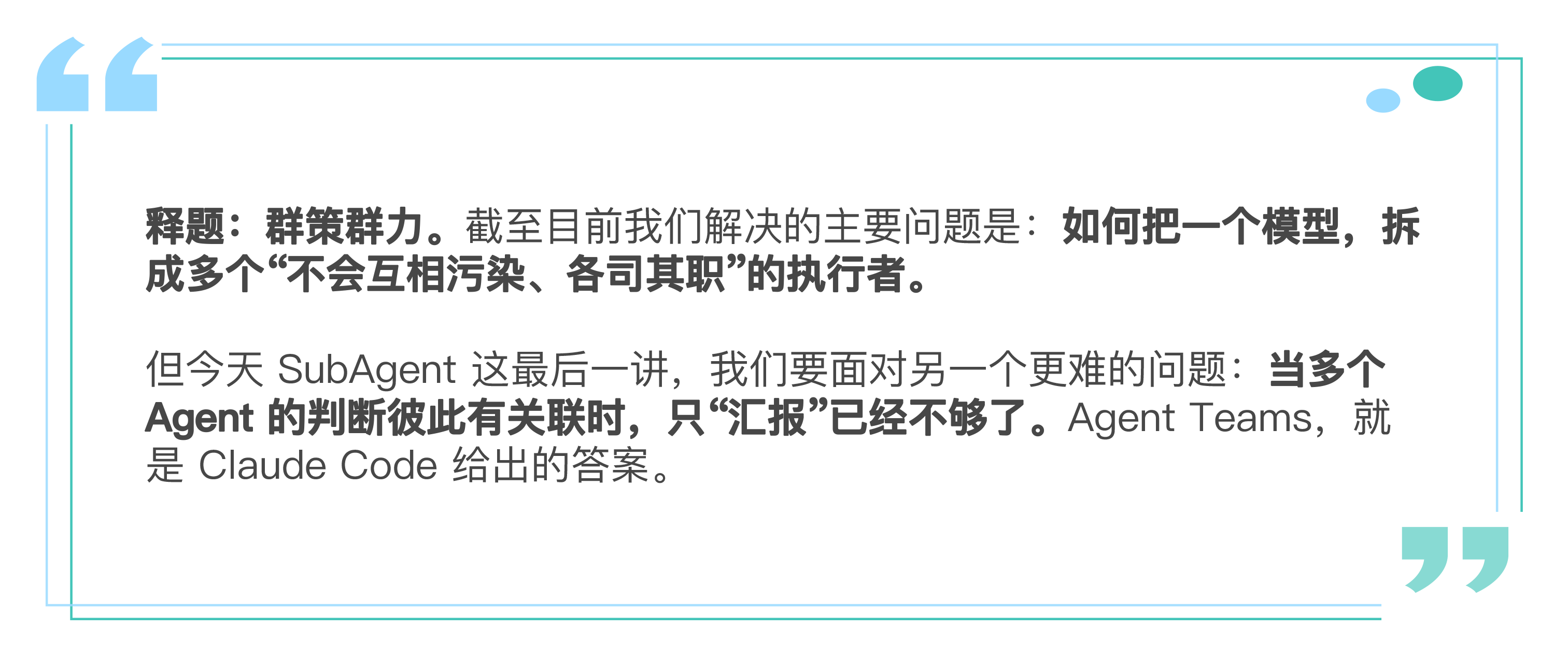 前面四讲我们深入学习了子代理(Sub-Agents)——从核心概念到只读型、高噪声处理,再到并行探索和流水线编排的实操案例。今天我们要探索一个更进阶的(也是新鲜出炉的)协作模式:Agent Teams(智能体团队)。