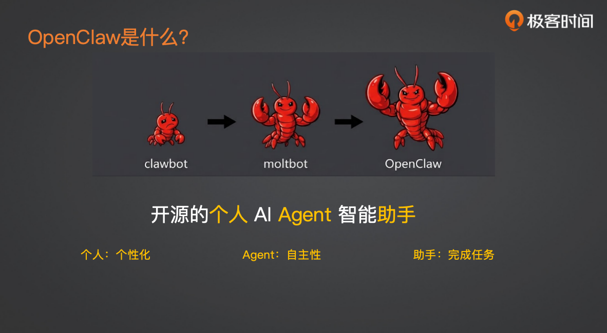 因为有些同学可能之前没听过,我们先来说说 OpenClaw 是什么。OpenClaw 其实最早火的时候名字叫 CrawlBot,它的标志是一个龙虾图案。后来因为商标问题被迫改名,中间迅速改名叫 MoteBot,最后定为现在的名字——OpenClaw。所以大家在网上看到的 CrawlBot、MoteBot、OpenClaw,其实是一个东西,只是中间换了名字。