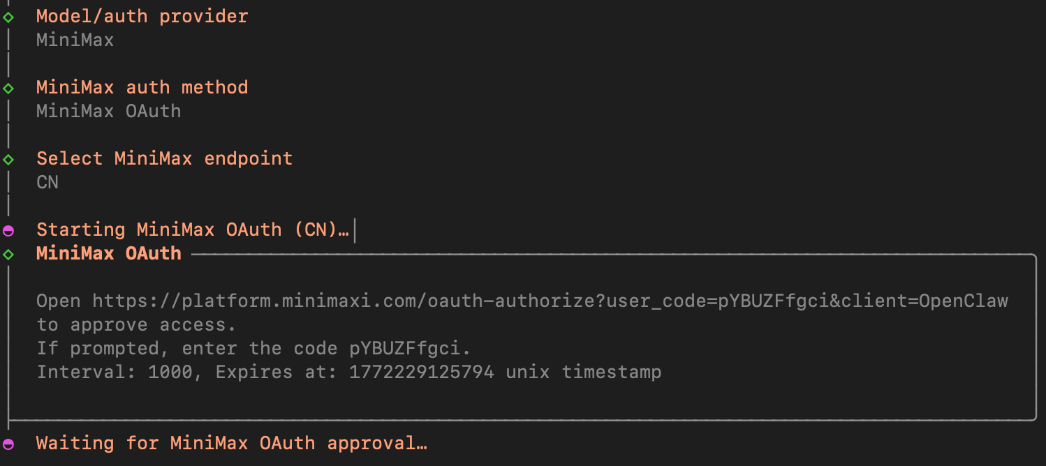 MiniMax auth method 选择 MiniMax OAuth,Select MiniMax endpoing 选择 CN。然后复制授权的 URL 地址,在浏览器的新 Tab 页打开这个地址,为 OpenClaw 授权 (授权之前需要先登录 MiniMax)。