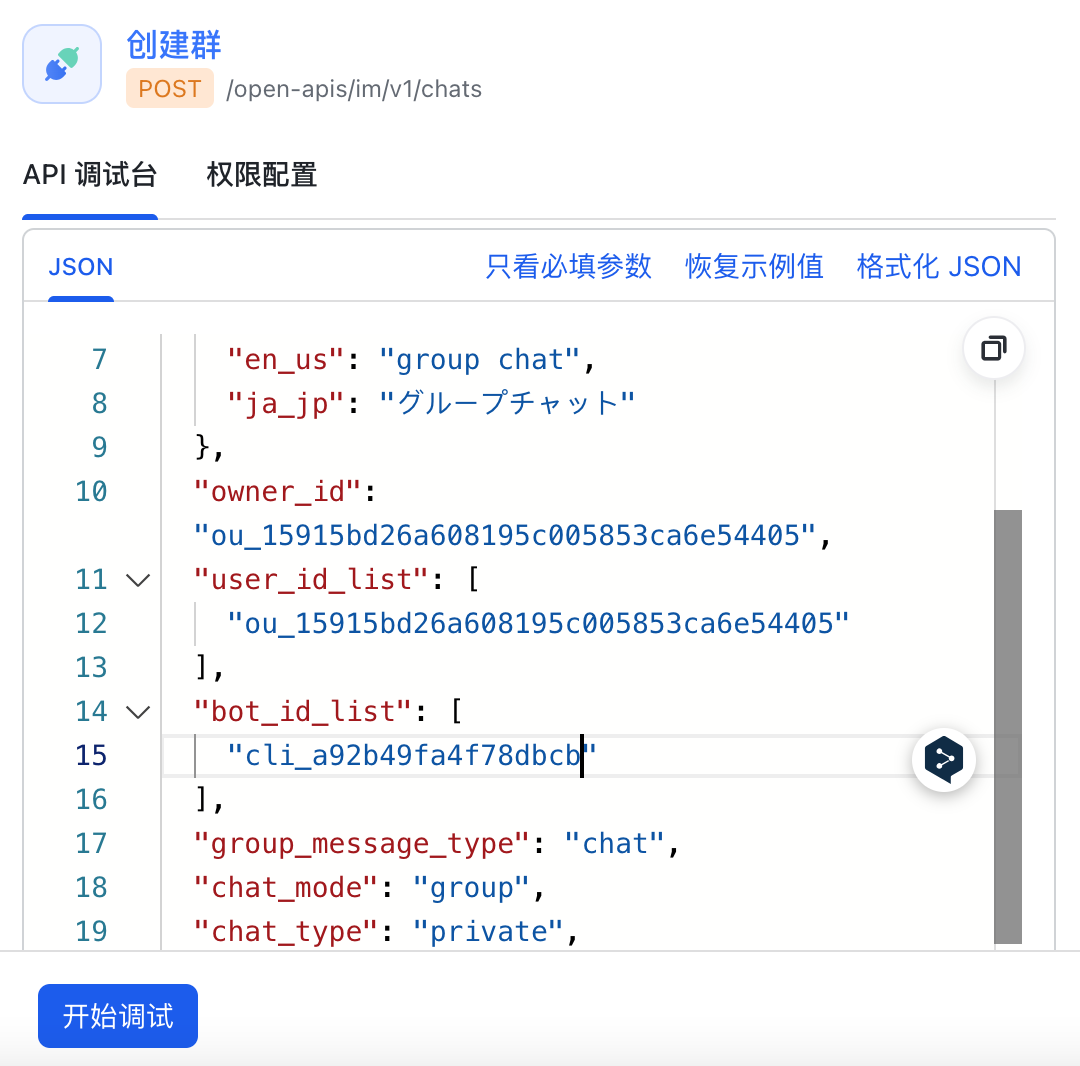 将 JSON 内容中的 owner_id、user_id_list 都替换为刚才复制的用户的 open_id,将 bot_id_list 修改为刚才创建的应用的 App ID。要创建的群的 name、description 可以做一下修改。然后点击“开始调试”。
