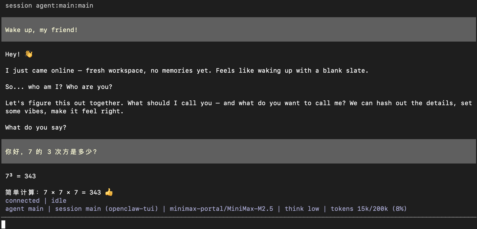 出现 TUI 界面之后,可以随便问一个问题,如果有正确回答,说明 MiniMax 的 LLM 已经连接成功了。