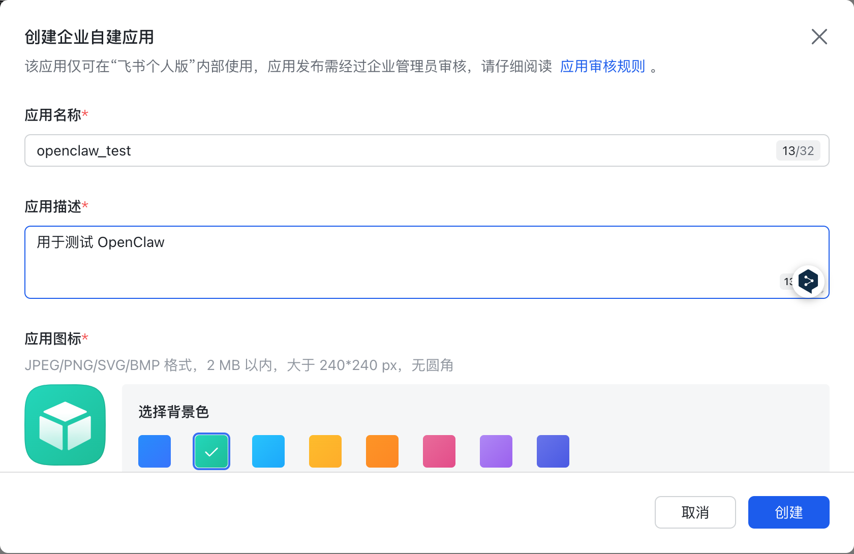 OpenClaw 的服务使用的是即时通讯工具的机器人用户,因此需要先创建一个机器人用户。在飞书中创建机器人用户有些繁琐,机器人用户是跟一个应用绑定的,首先需要创建一个应用,还需要设置应用的权限。我来详细讲一下具体的步骤。