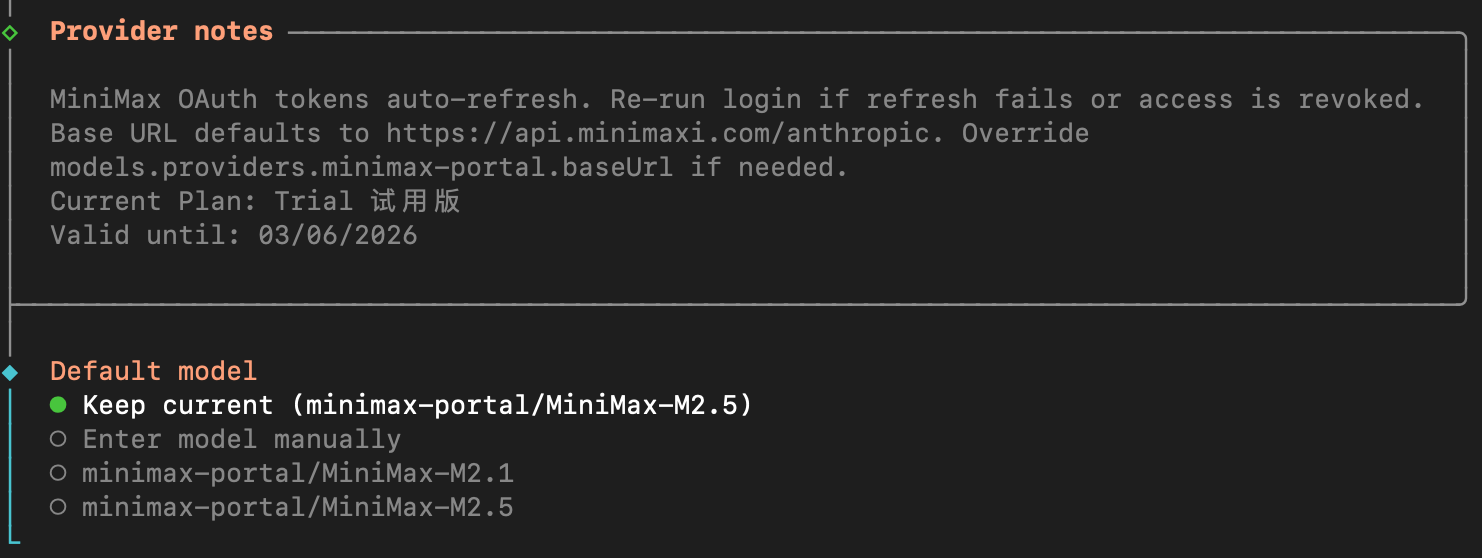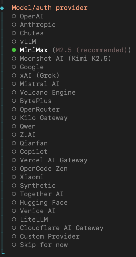 OpenClaw 官方可用的 LLM 厂商很多,国外厂商 / 平台可以选择 OpenAI、Anthropic、Google、Copilot、xAI、Kilo Gateway、OpenRouter、Hugging Face 等等,国内厂商可以选择 Qwen、Qianfan、MiniMax、Moonshot AI 、Xiaomi,还有在本地通过 vLLM、LiteLLM 部署的开源模型。