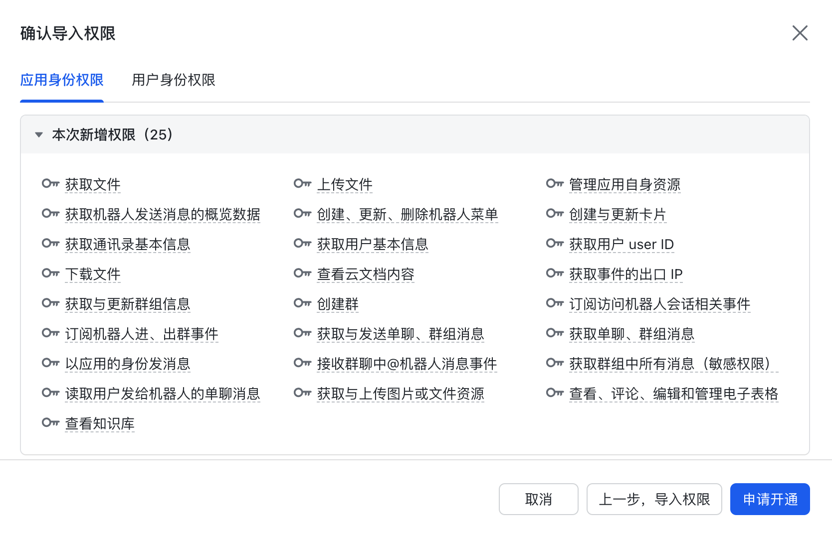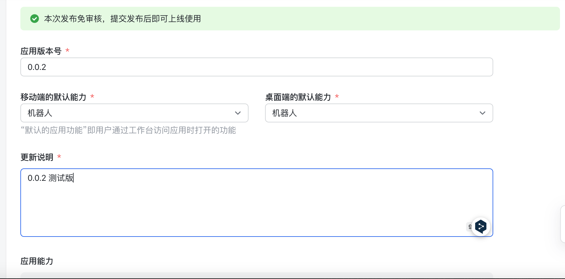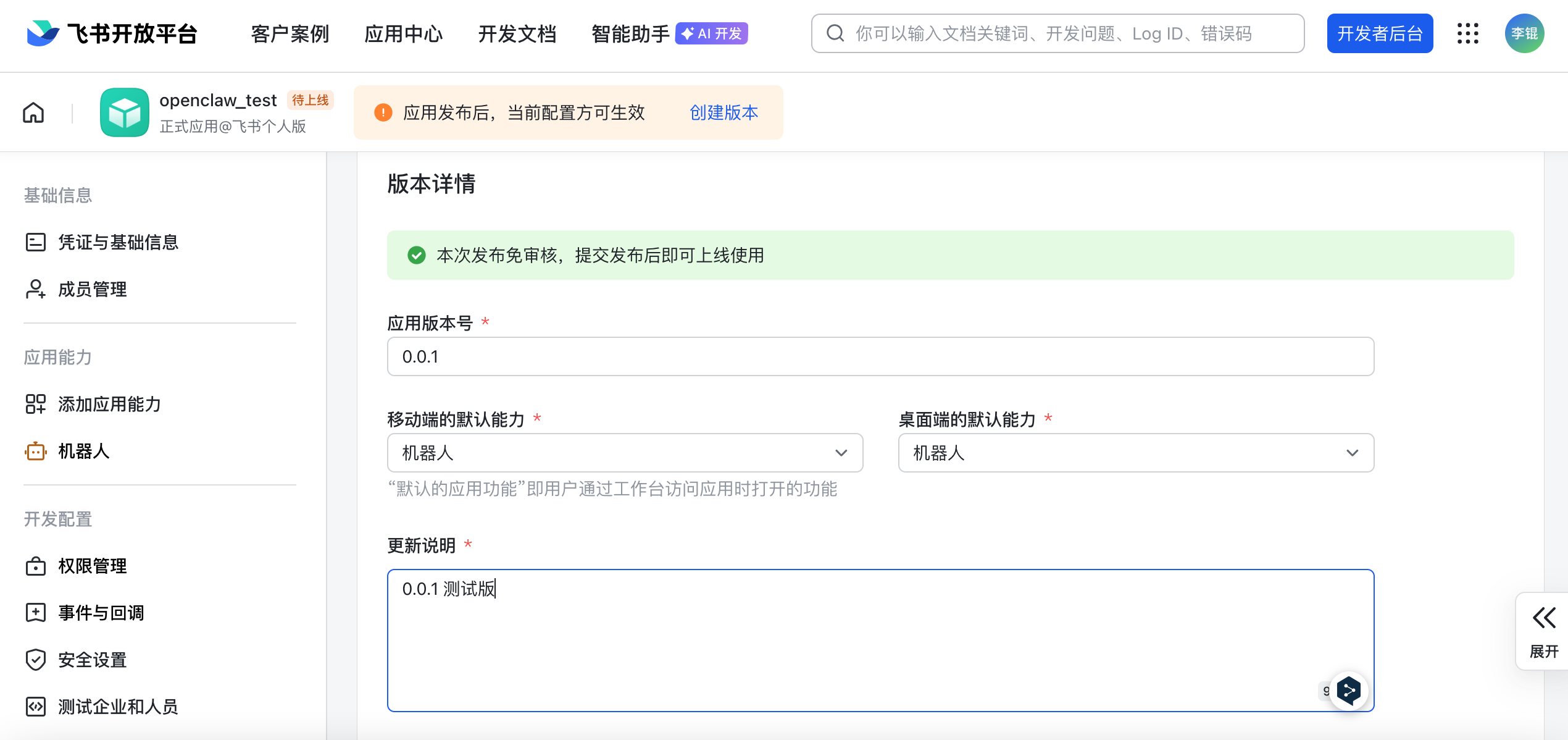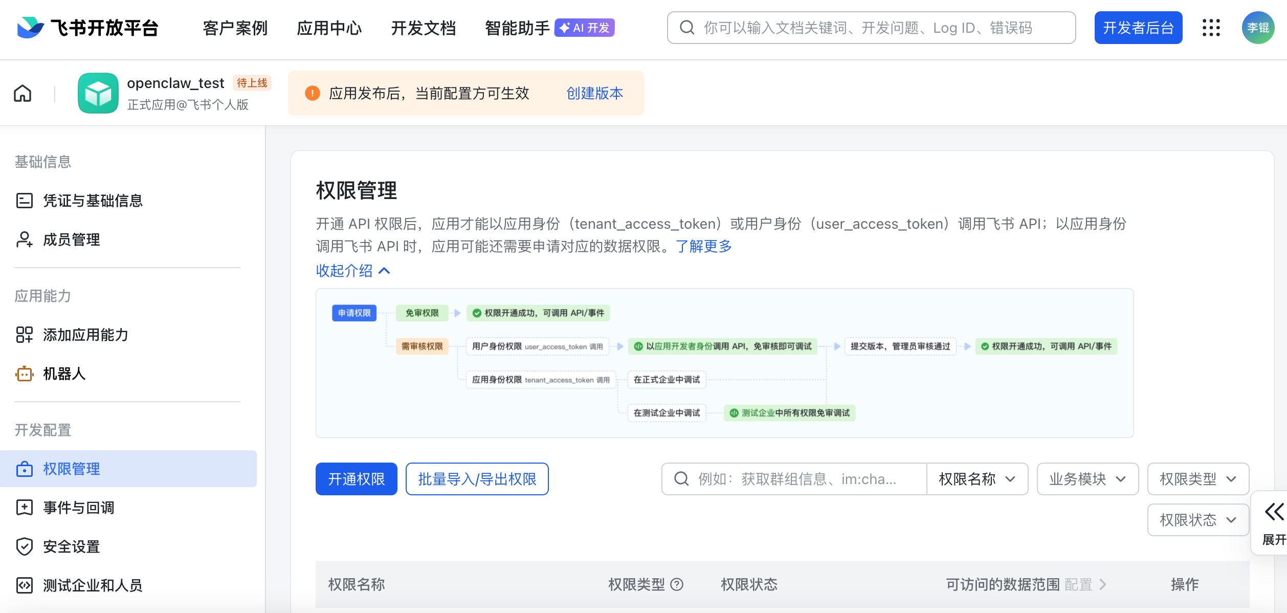 以后只要你在飞书的开发者后台看到警告“应用发布后,当前配置方可生效”,你都需要创建新版本并且重新发布。