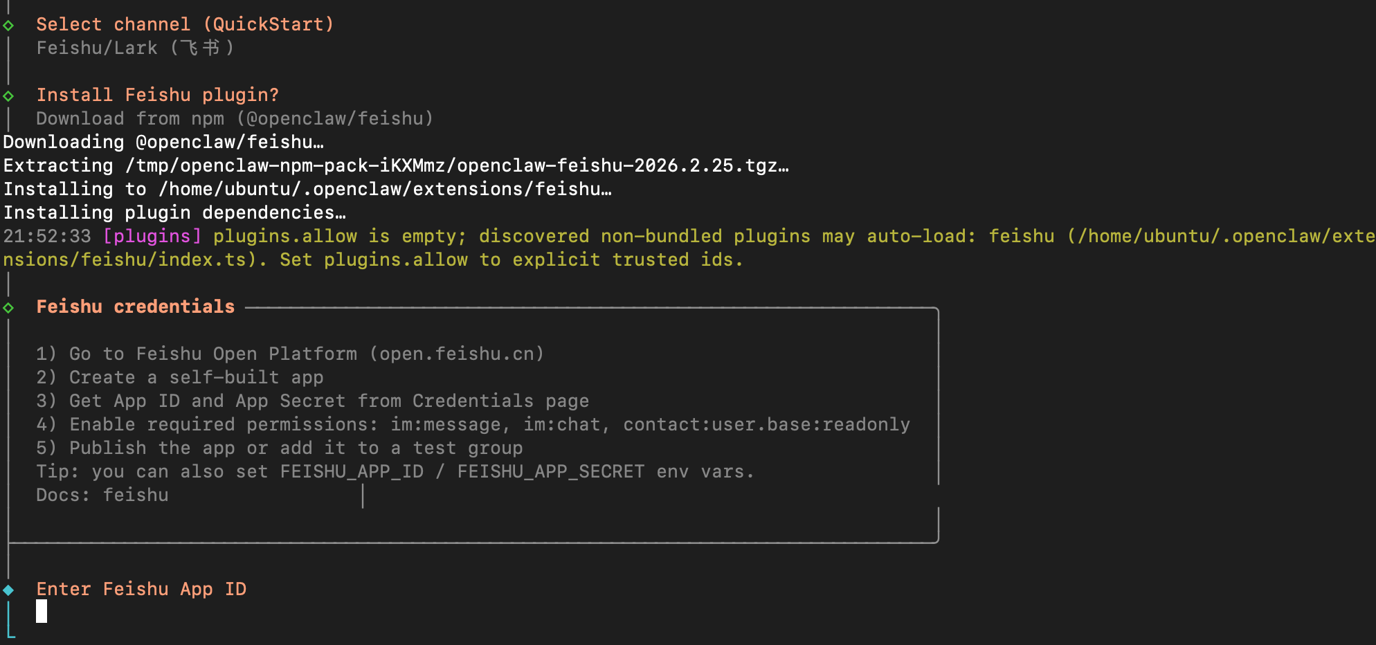 Config warnings:\n- plugins.entries.feishu: plugin feishu: duplicate plugin id detected; later plugin may be overridden (/home/ubuntu/.npm-global/lib/node_modules/openclaw/extensions/feishu/index.ts)