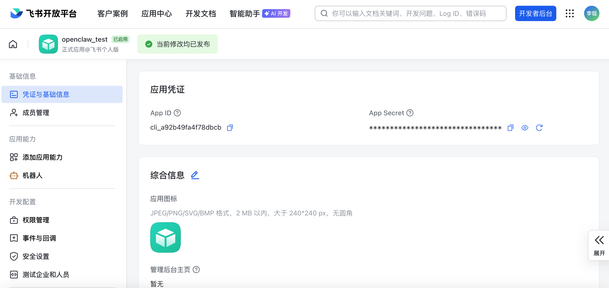选择左侧菜单栏中的“凭证与基础信息”,复制 App ID 和 App Secret,将这两个信息保存在一个安全的地方,之后会用到。