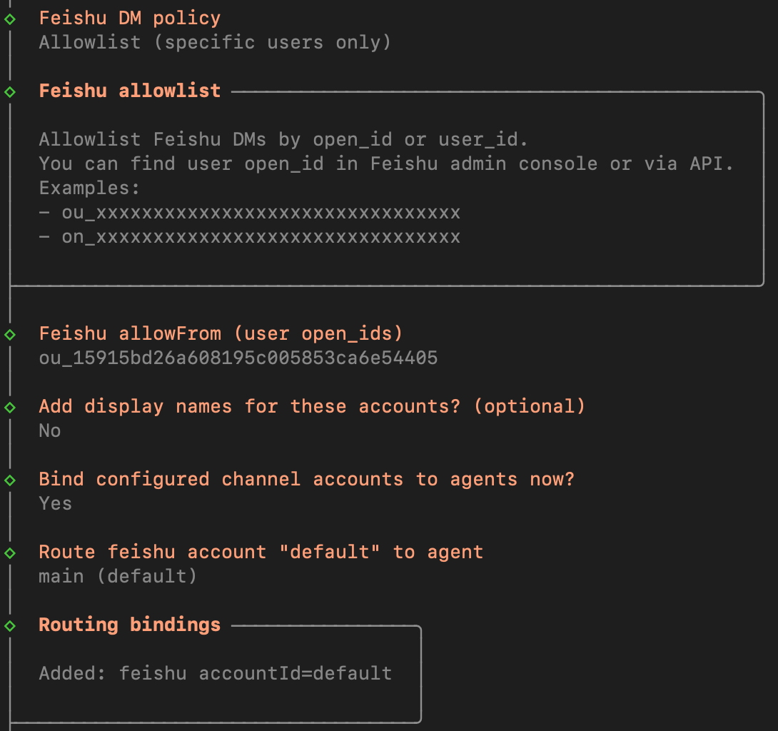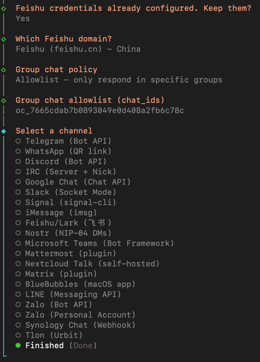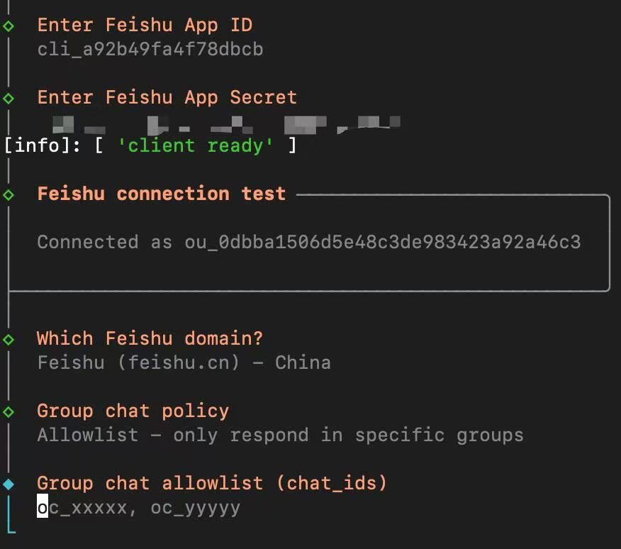 Group chat allowlist,输入刚刚在飞书 API 调试台创建的群的 chat_id。