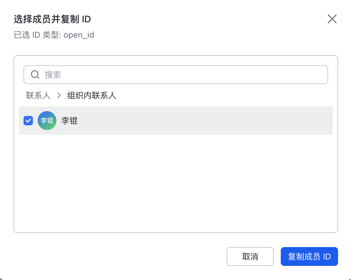 在下面对话框中,选择你的飞书用户,点击“复制成员 ID”.