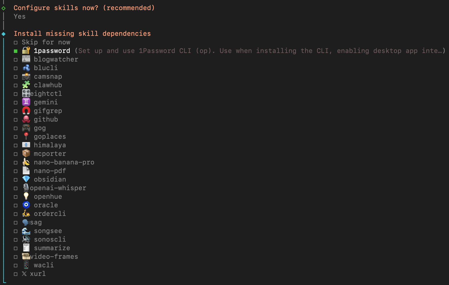 Configure skills now? (recommended),选择 Yes,然后根据需要选择所需的 Skill。不过这一步略过也关系不大,可以以后再单独安装需要的 Skill。