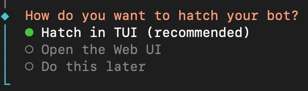 How do you want to hatch your bot? 选择 Hatch in TUI。