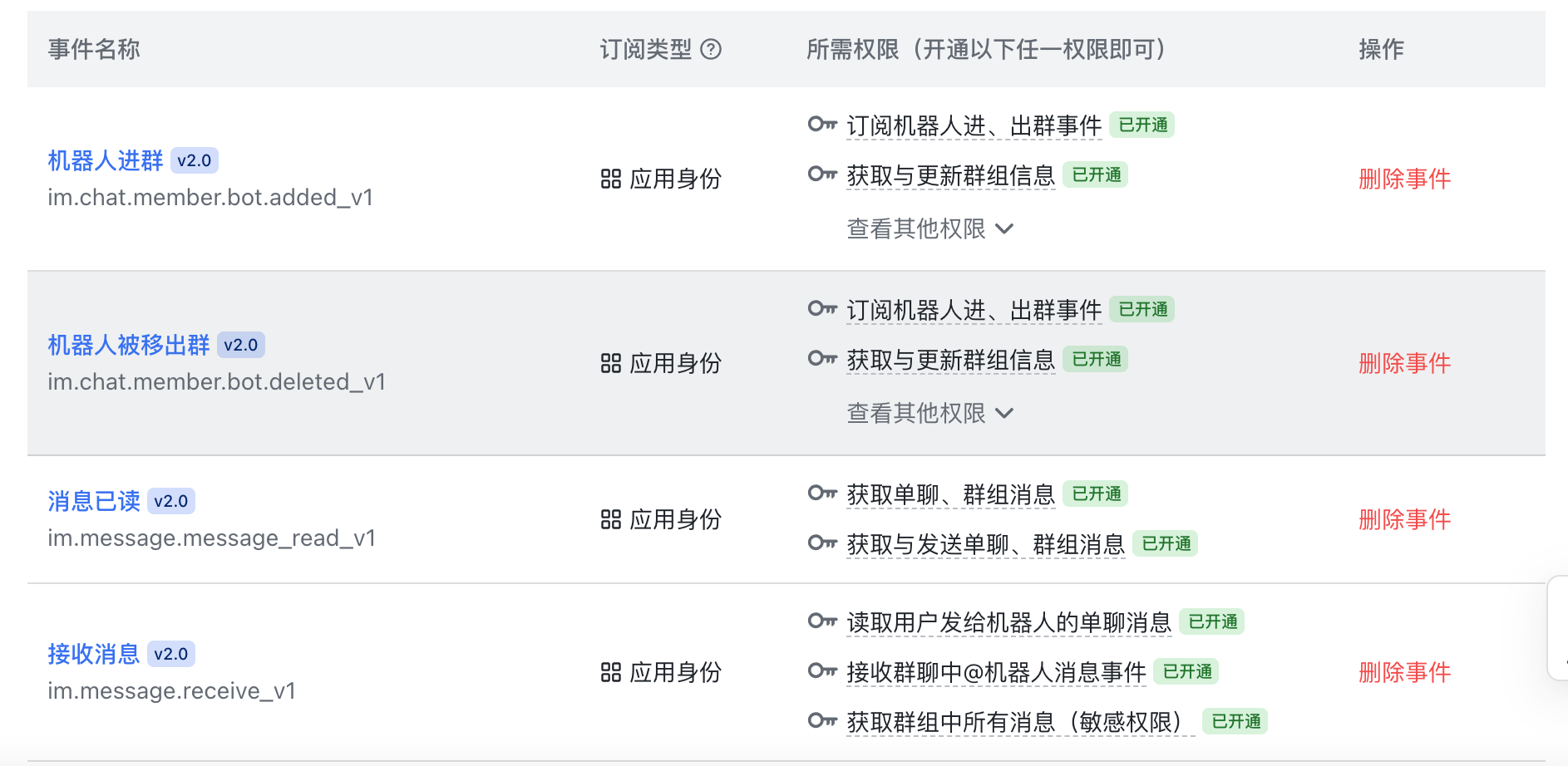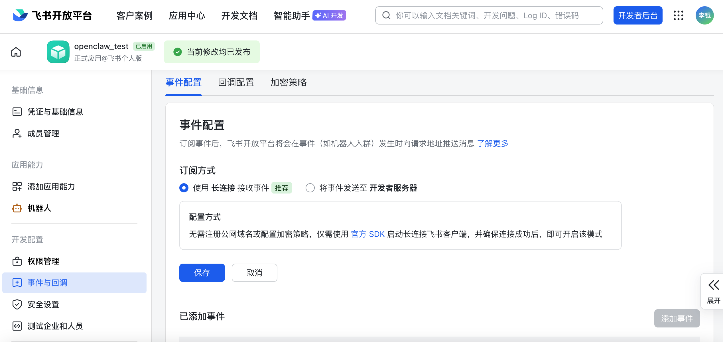 到了这里,重新回到上一节那个中断的位置,为飞书应用添加事件,并且重新发布应用。