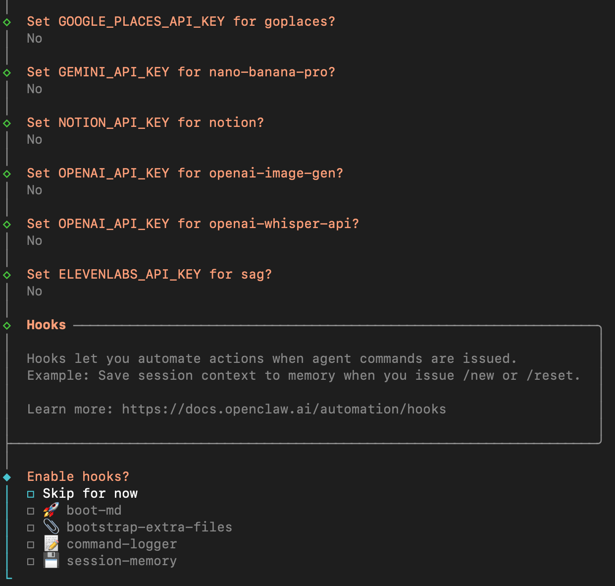 接下来会要求输入很多 API_KEY,这些服务都在国外,全部选择 No。