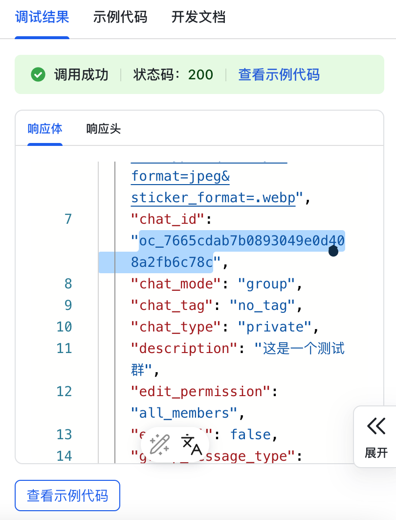 如果在右侧调试结果下面显示“调用成功”,群就创建好了。然后复制响应体中这个群的 chat_id,还有之前复制的用户的 open_id,可以与 App ID、App Secret 保存在一起,后面很快会用到。