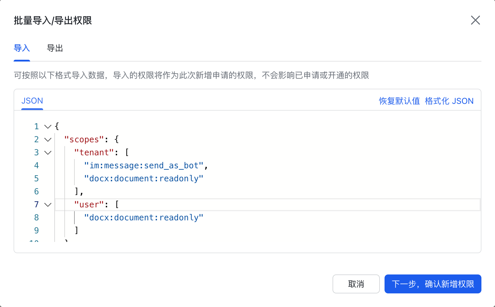 复制以下内容,替换上面对话框中的 JSON 内容,然后点击“下一步,确认新增权限”。