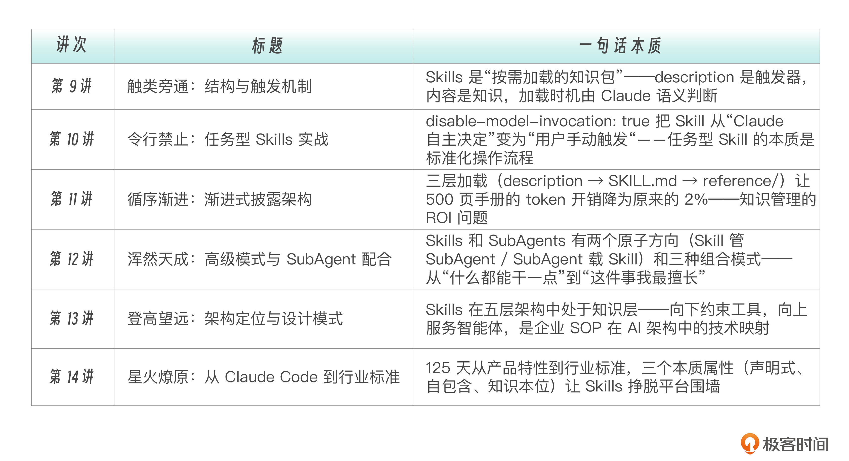 经过六讲的学习,我们完整走过了 Skills 从语法到架构再到行业标准的全路径。今天的加餐,我们一起整体回顾一下我们所学习过的 Skills 系统的设计逻辑和知识地图。