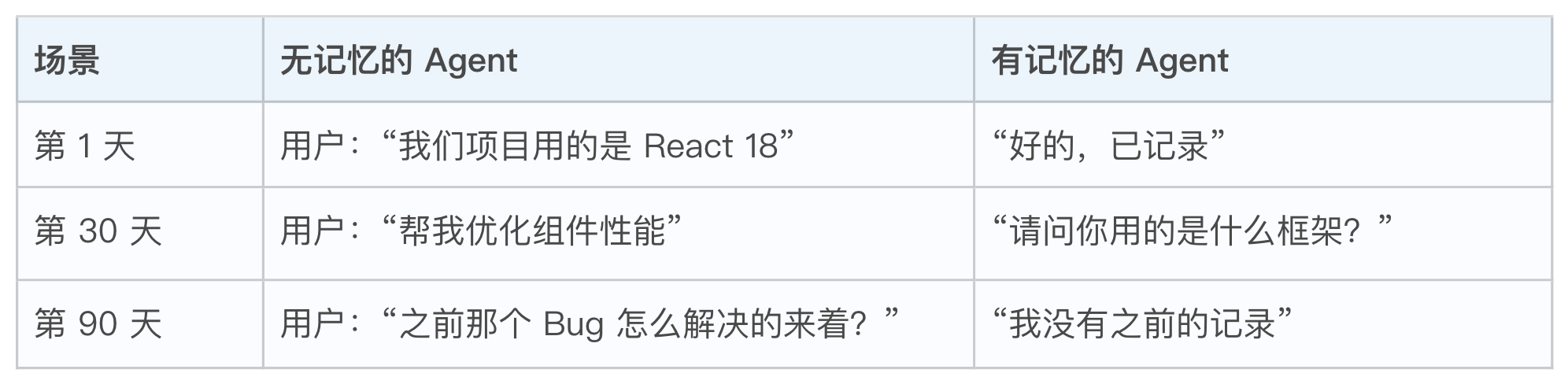差距一目了然。Memory 系统的存在意义,就是让 Agent 拥有跨会话的持久记忆能力,从“金鱼脑”进化为真正的智能助手。
