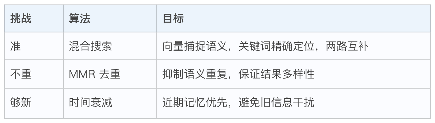 这三个算法分别解决记忆检索中的三大核心挑战: