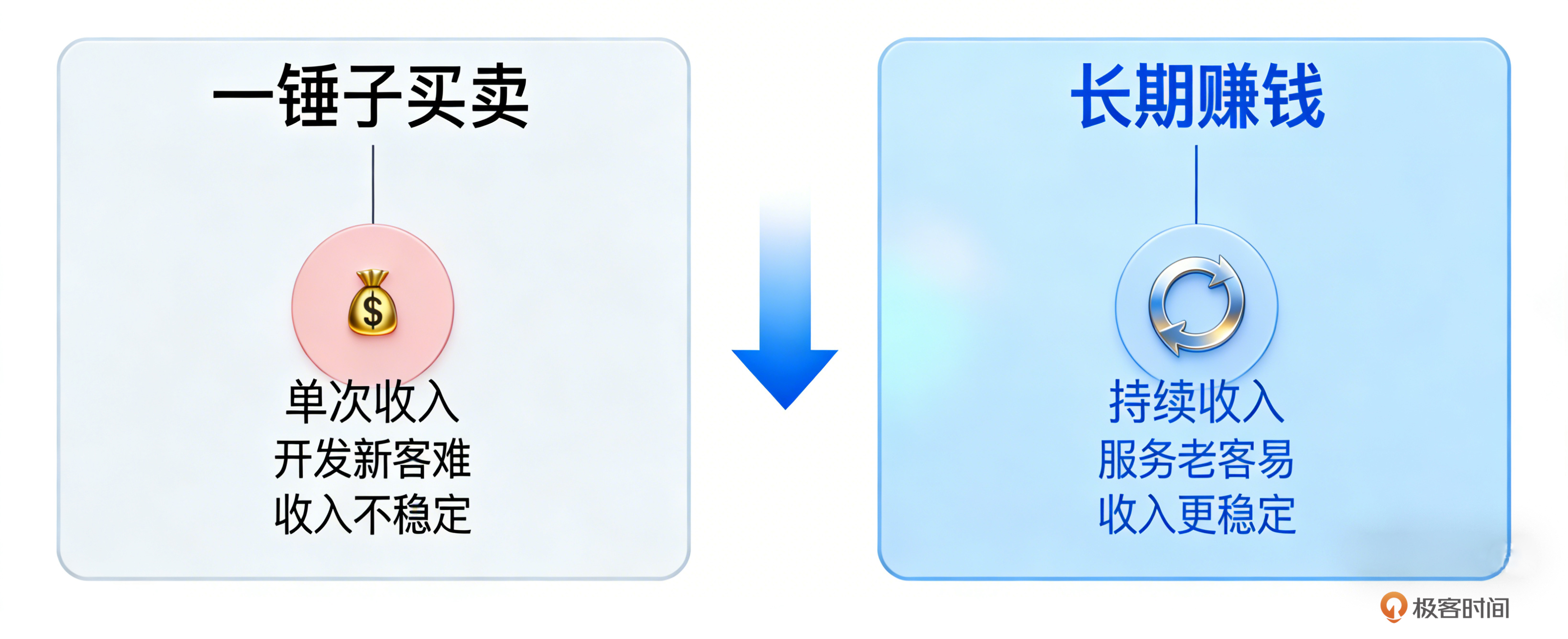 你看这张图,左边是“一锤子买卖”,像是一次性的网站开发、某个特定的营销方案设计。右边是“长期赚钱”,比如持续的软件订阅、年度顾问服务、内容代运营。