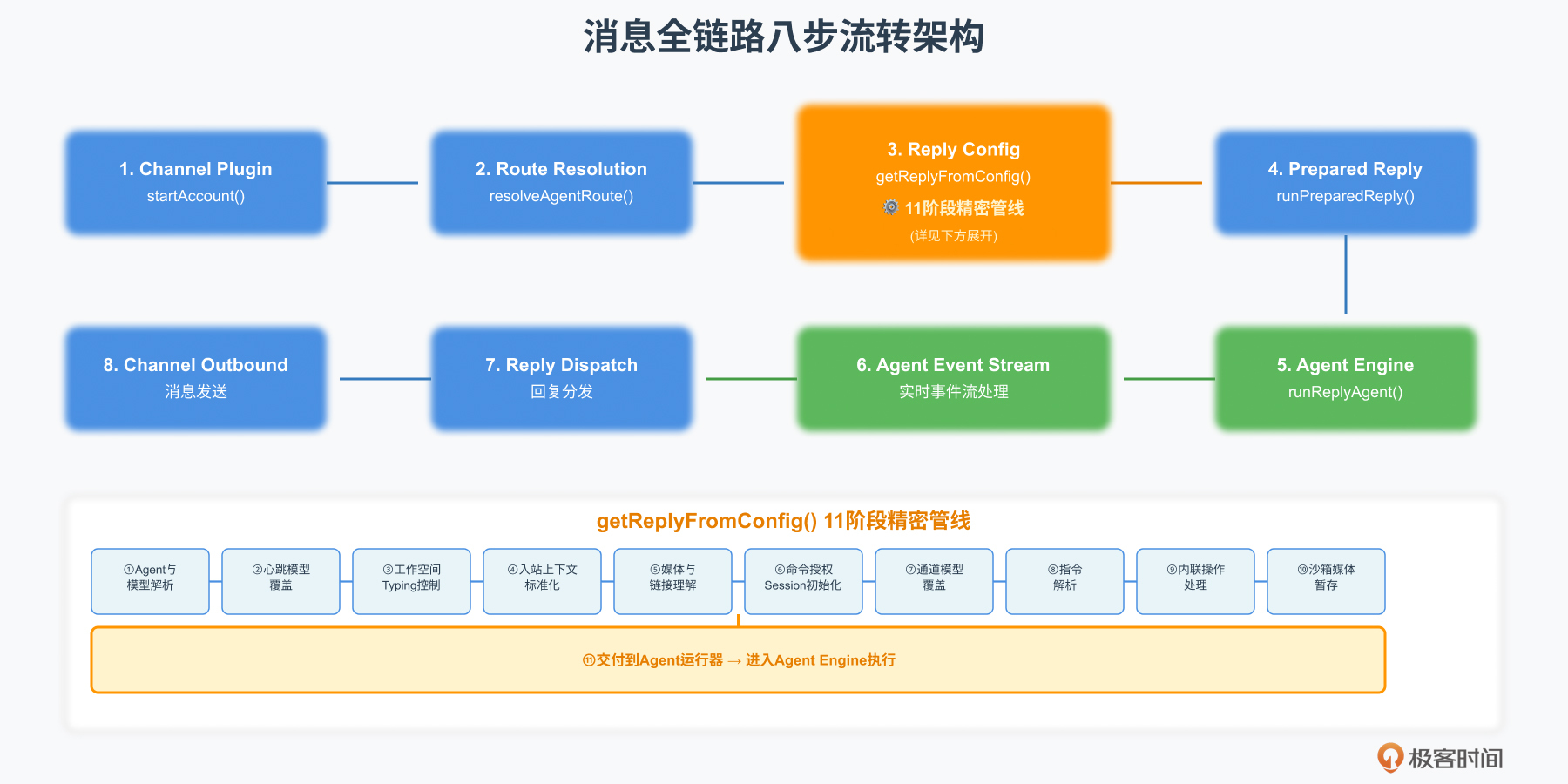当你在 Telegram 向机器人发送一条消息,到收到 AI 的回复,中间究竟经历了什么?这个看似简单的交互背后,隐藏着一条精密的处理链路。今天这节课,我们要建立消息从“进入”到“回复”的完整流转图景,理解每一站的职责,然后深入拆解回复生成入口的 11 阶段精密管线。