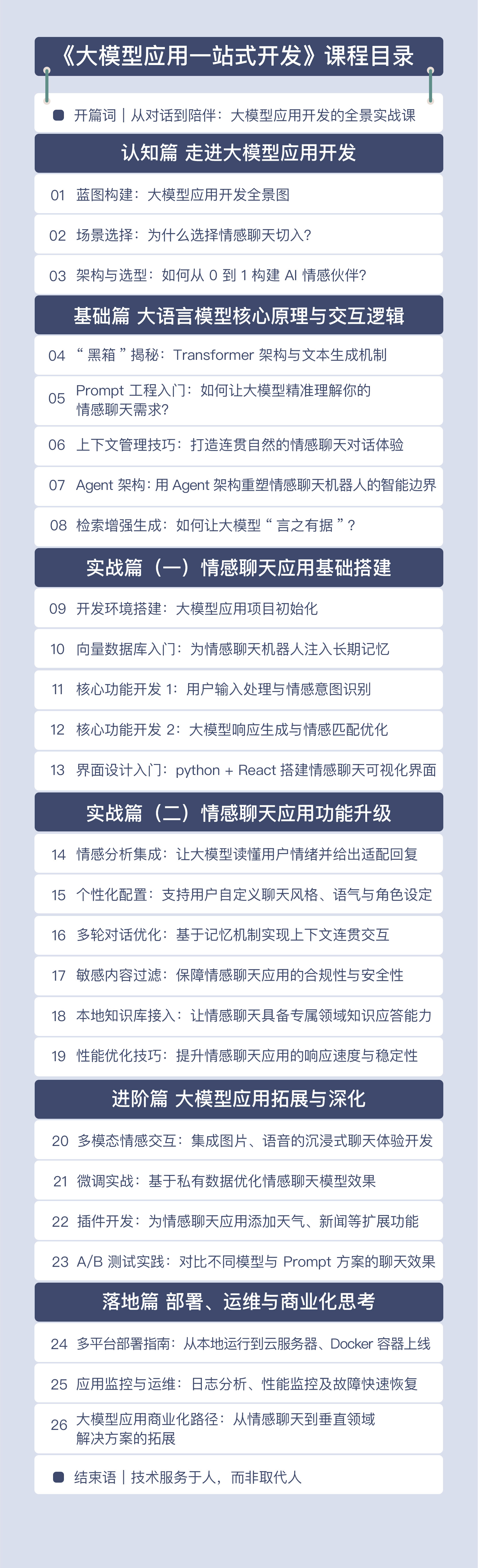 为此我们邀请了袁从德老师开设《大模型应用一站式开发》课程。我们将通过一个情感聊天应用项目的全流程实战,带你深入开发全生命周期,构建一个真正的 AI 原生产品。课程里学到的技术框架、架构与产品思维、智能体实现方法,也能迁移到其他大模型应用开发上。