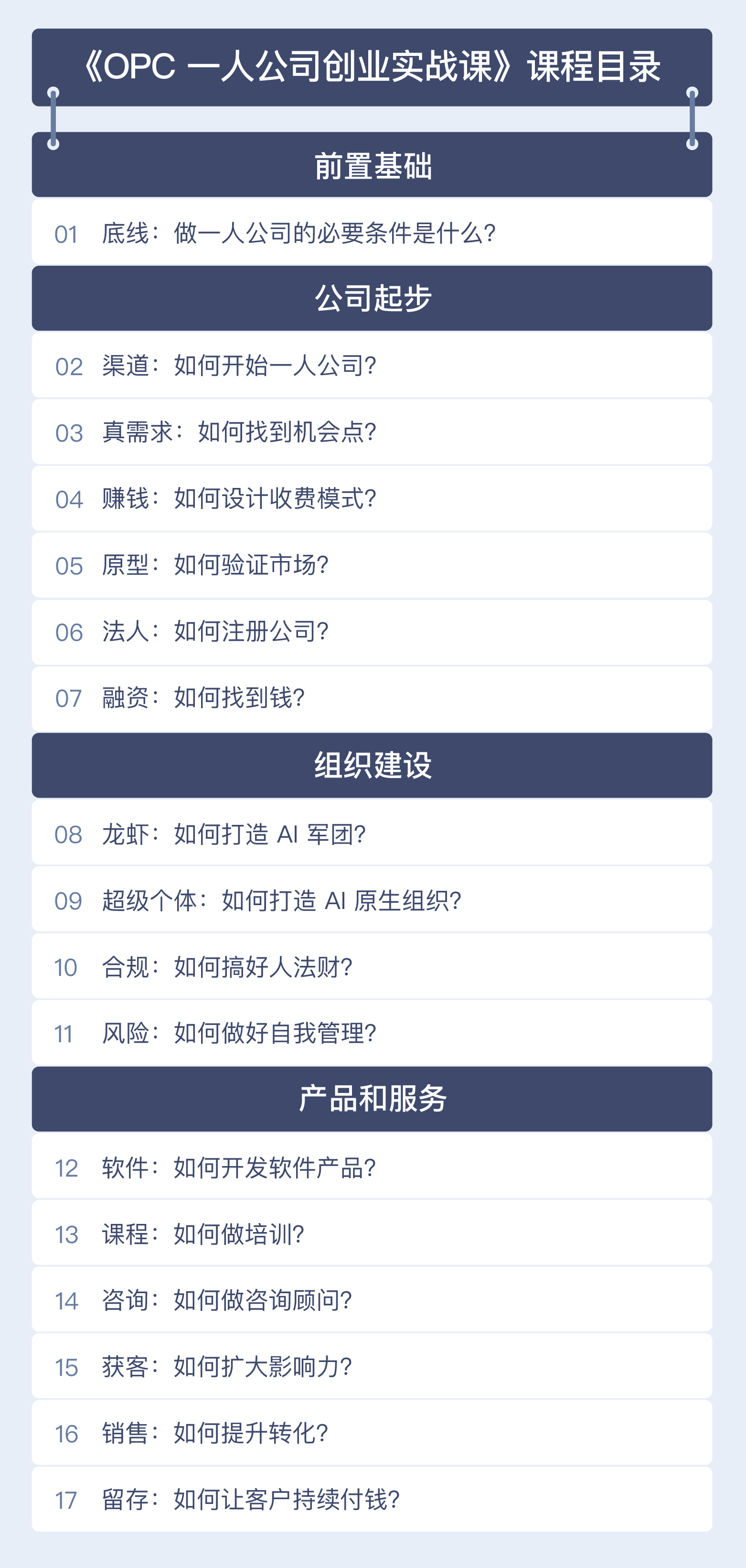本课程以“用 AI 放大你的个人力量”为核心,搭建起从创业底线认知、公司起步落地,到 AI 原生组织搭建、产品盈利闭环的完整 OPC 创业学习路径,手把手教你快速启动一人公司,借助 OpenClaw 打造专属 AI 军团,实现个人创业能力的全面突破与成长。