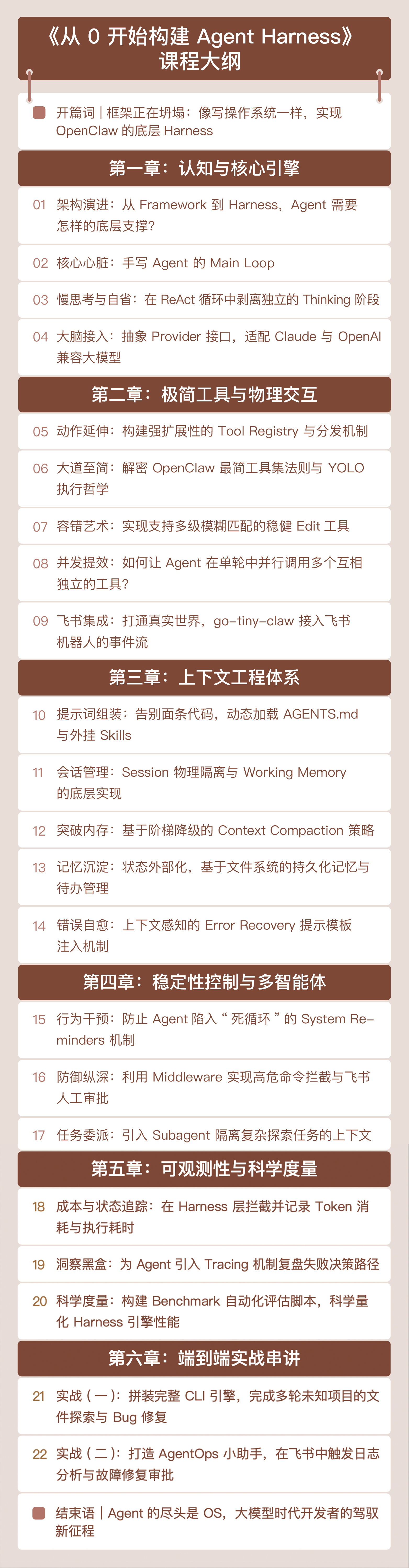 为了带你走出这些困境,我们特别邀请了资深架构师 Tony Bai,他将以 OpenClaw 极简哲学为灵魂,带你复刻一个 Agent Harness,真正实现 AI Agent 的稳定、可控与持久,建立系统级架构设计思维,并拥有工业级引擎构建的实战经验。