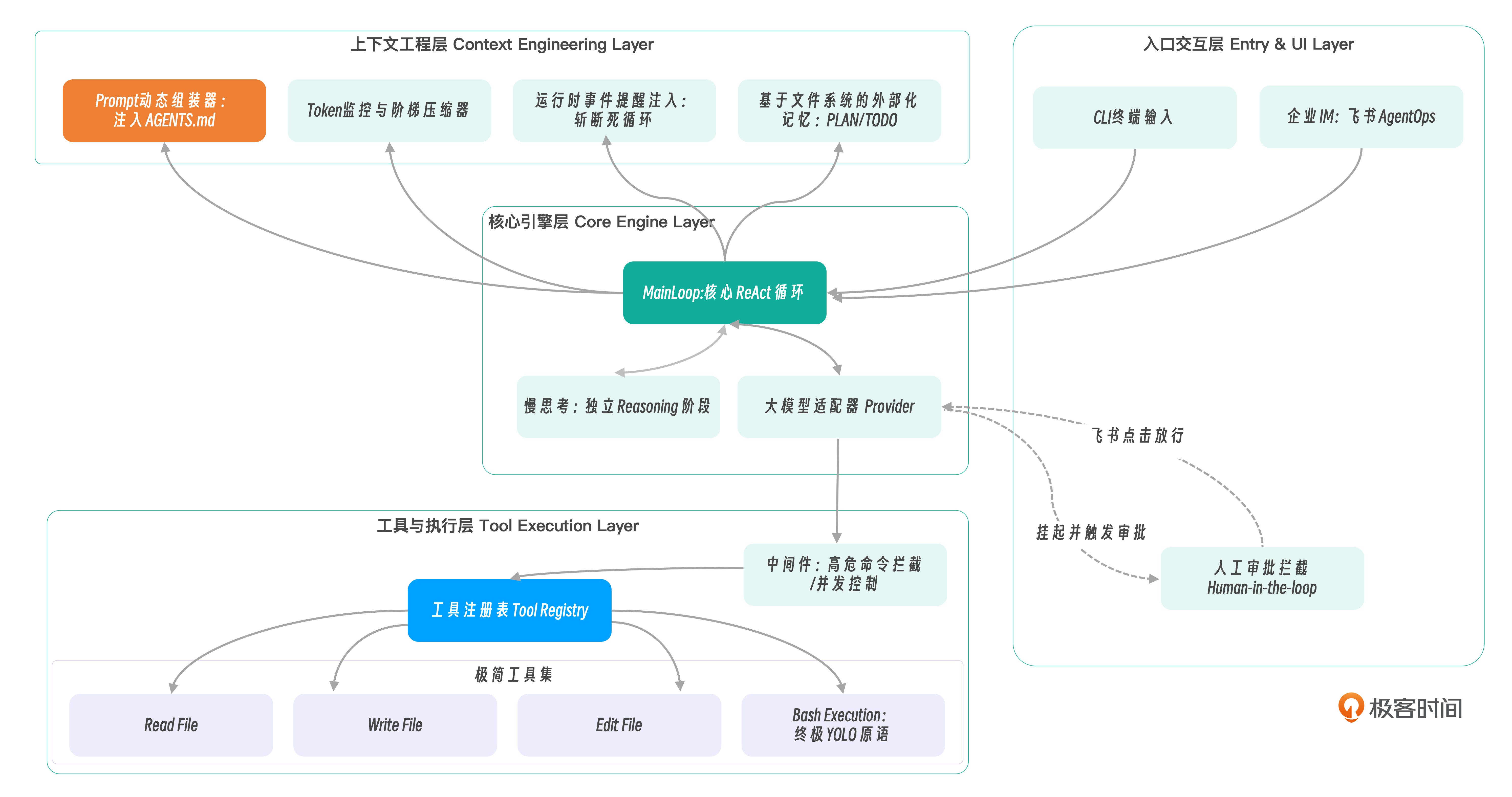 这是决定 Agent 智商的生命线。我们将实现系统提示词的动态组装、超长文本的阶梯降级压缩(Compaction);更重要的是,摒弃复杂的内部状态机,把“记忆”与“待办”完全外部化为本地的文件系统。