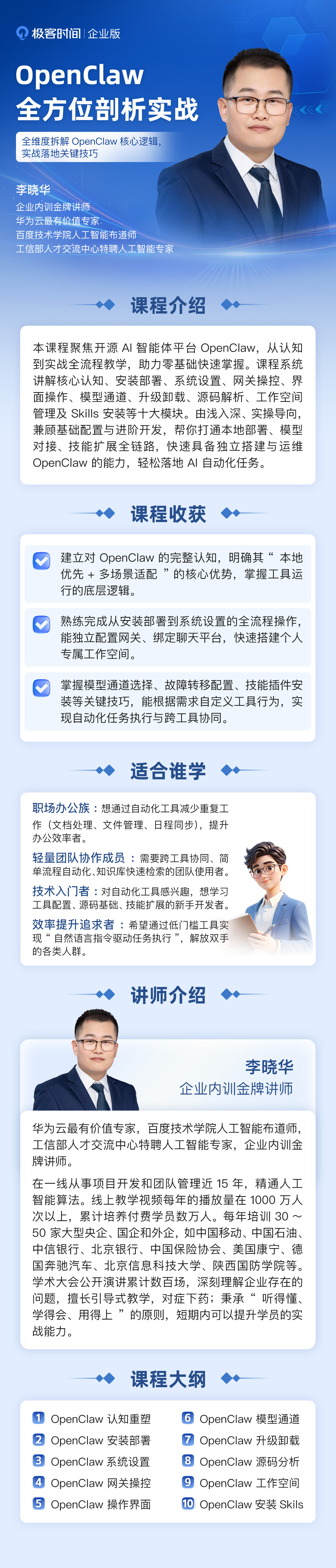 由浅入深、实操导向,兼顾基础配置与进阶开发,帮你打通本地部署、模型对接、技能扩展全链路,快速具备独立搭建与运维 OpenClaw 的能力,轻松落地 AI 自动化任务。