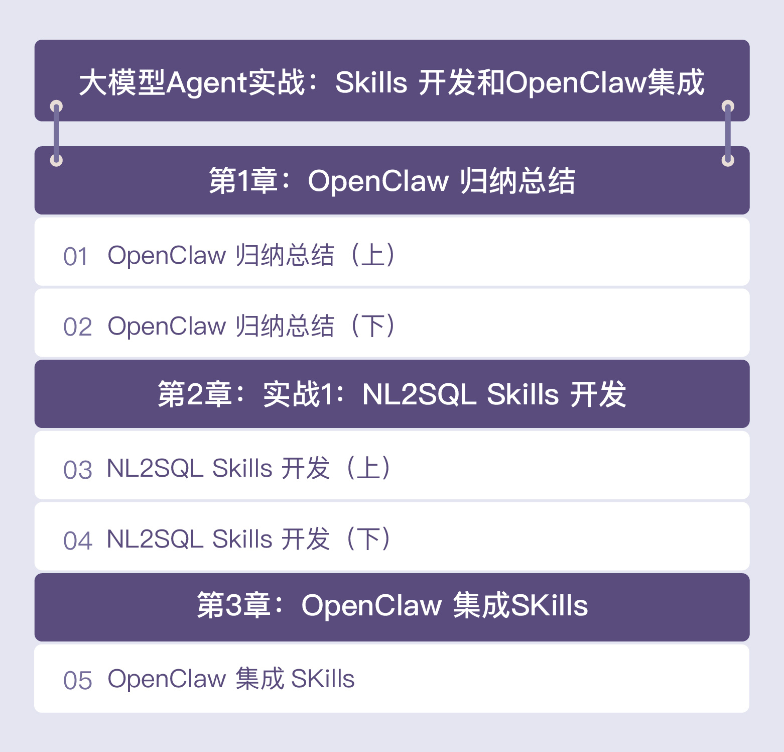 大模型时代,后端工程师正从“接口搬运工”跃升为“智能体架构师”!本课程直击 Agent 工程核心——Skills 开发与 OpenClaw 平台集成。你将亲手打造可注册、可调试、可沙箱运行的标准化技能插件,掌握接口契约设计、动态加载机制、上下文感知调用及多源工具适配等硬核能力;更通过央企 AI 中台真实案例,实战性能优化与生产部署。学完即能构建企业级自动化任务链:比如自动解析合同 PDF→调用风控 API→生成审计报告。技能直通高薪岗位——智能系统架构师、AI 工程化专家、大模型后端负责人。代码有温度,架构有深度,你的下一次技术跃迁,就从这里开始!(238 字)