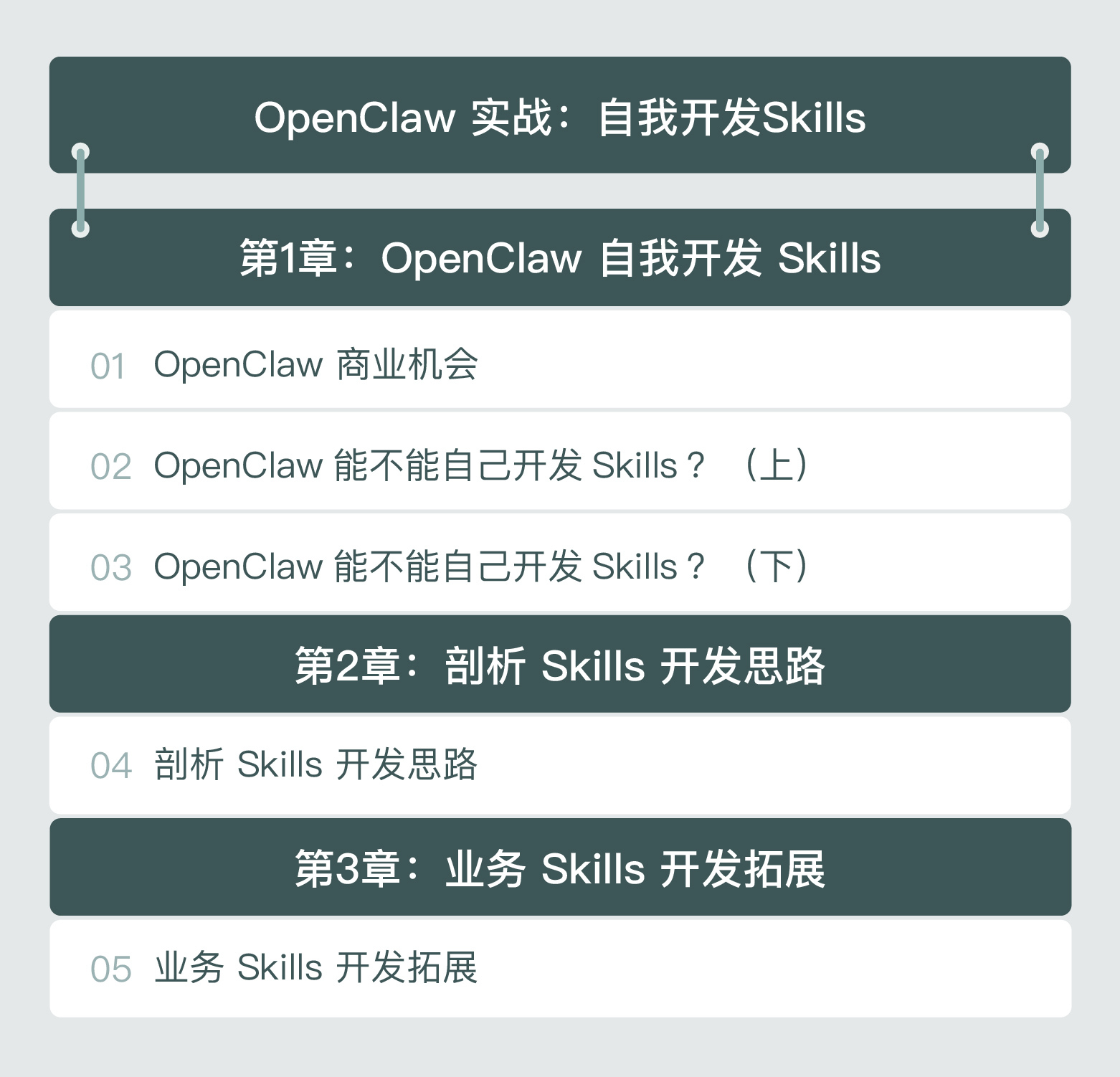 课程围绕 OpenClaw 自我开发的核心要点展开,帮助你清晰建立技能开发的整体认知框架。我们将深入浅出地讲解技能开发的底层思路与设计逻辑,让你不仅会写代码,更懂得如何规划和组织一个完整的技能项目。更重要的是,课程将引导你学会将开发技能与实际业务场景相结合,掌握从业务需求出发拓展技能的核心方法,最终形成“基础技能 - 开发思路 - 业务应用”的完整知识链。