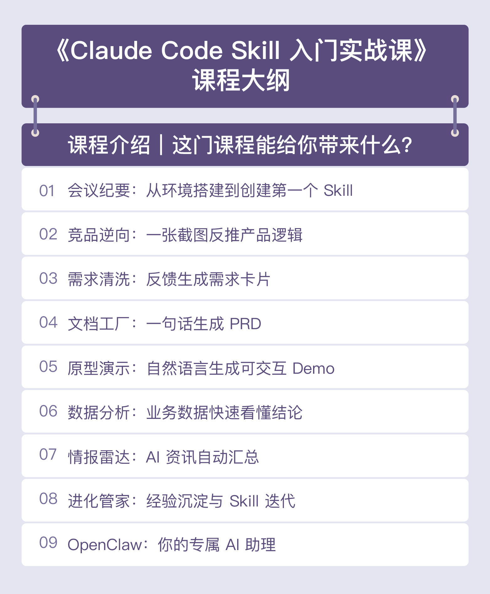 课程零基础可学,全程实战落地。手把手带你完成 Claude Code 开发环境配置,系统掌握小白也能快速上手的 Skill 开发能力,最终你将亲手打造出 7 套覆盖日常工作全场景的实用 Skill,简单指令就能让 AI 按预设逻辑自动化完成工作,大幅提升工作效率。案例覆盖会议纪要、竞品分析、PRD 生成、数据分析等高频工作场景,一次封装、无限复用,带你实现 AI 驱动的工作流升级。