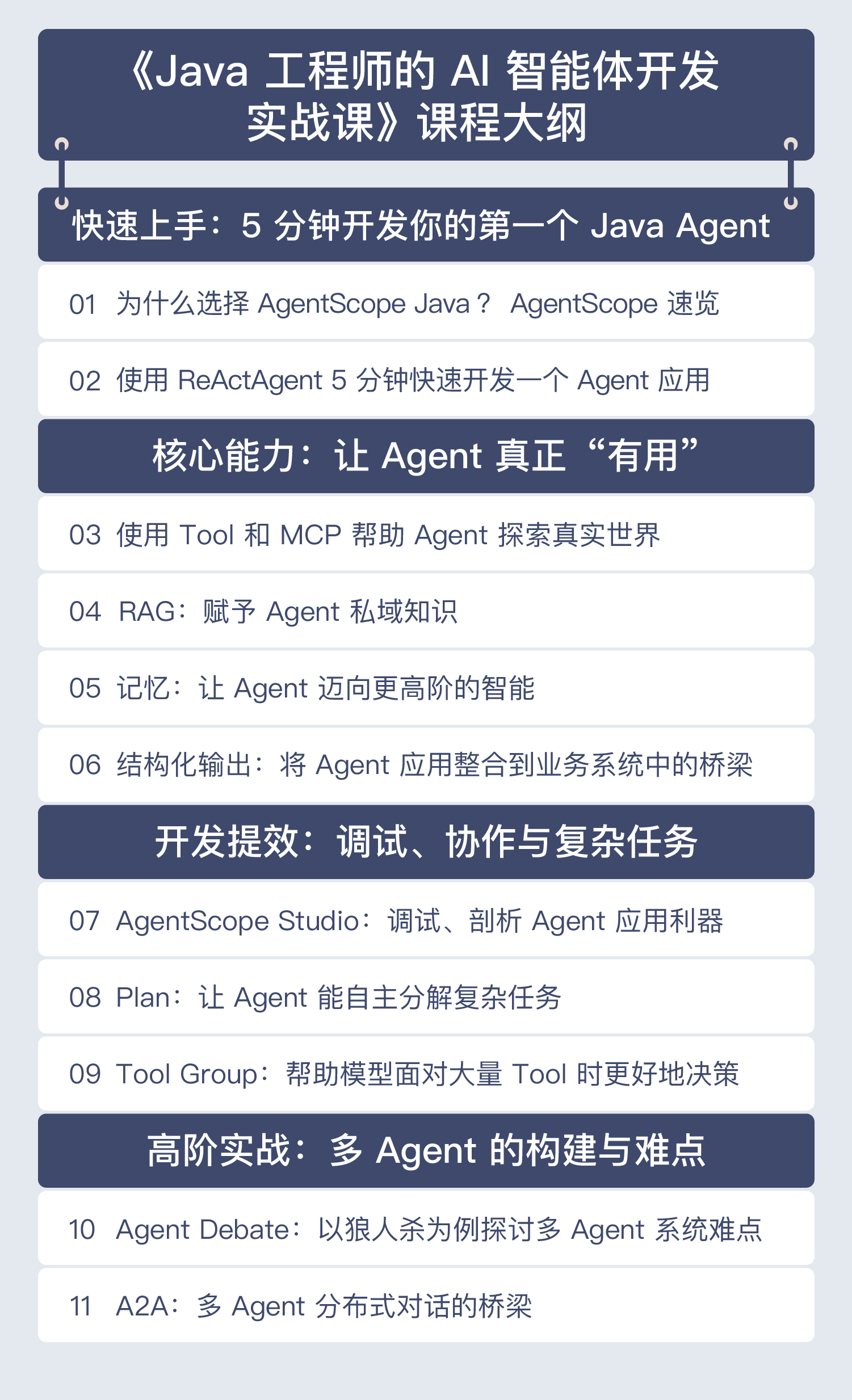 为了更好助力开发者高效上手,极客时间联合阿里云云原生应用平台 AgentScope Java 研发团队特别推出「AgentScope 极客公开课」,深入讲解框架核心能力与实战案例。无论你是想探索 AI 编程新范式,还是亟需将大模型能力嵌入现有业务系统,这套课程都将为你提供一条低门槛、高效率、可落地的 Java 原生路径。